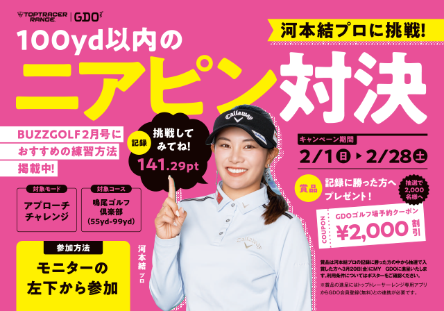 2月度GDO主催イベント「河本結プロに挑戦!ニアピン対決」のご案内 トップトレーサー・レンジの「アプローチチャレンジ」モードの「鳴尾ゴルフ倶楽部」にて9ホールのアプローチをすると、ホールごとのポイントがつきます。 ポイントはピンに近いほど少ない数字となります。 河本結プロの9ホール合計ポイント141.29ptを下回れば勝ちとなります。 開催期間:2/1(日)~28(土) 参加方法:トップトレーサー・レンジアプリをスマホにダウンロードの上、打席モニターの左下にある「鳴尾ゴルフ倶楽部」をクリックし、9ホールをラウンド。 勝者賞品:河本結プロの記録に勝った(下回った)方には、抽選で2,000名様に「GDOゴルフ場予約クーポン2,000円割引」をプレゼント。