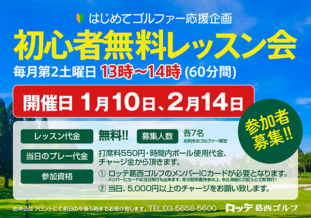 初心者無料レッスン会のご案内 開催日:2026/1/10(土)、2/14(土)※毎月第2土曜日 13時~14時(60分間) レッスン代金:無料!! 募集人数:各7名(右利きのゴルファー限定) 当日のプレー代金:打席料550円と時間内ボール使用代金をメンバーICカードのチャージ金から頂きます。 参加資格: ① メンバーICカード保有者(当日発行可能) ② 当日5,000円以上をチャージの上、領収書をご提示ください。 予約:フロントにて前日の17:00まで受付致します。