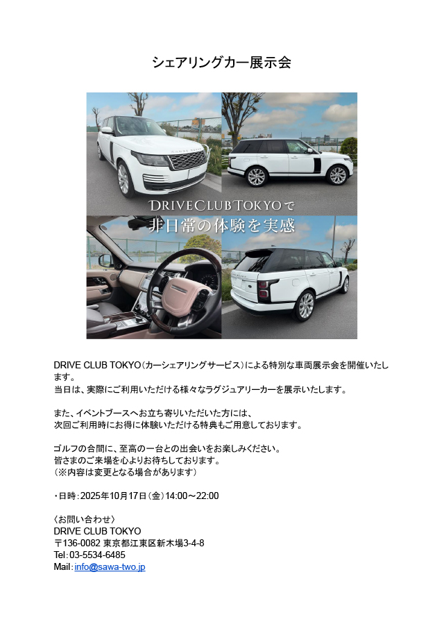 シェアリングカー展示会 ロッテ葛西ゴルフにて初開催!! DRIVE CLUB TOKYO(カーシェアリングサービス)による特別な車両展示会を開催いたします。 是非お気軽にお立ち寄りください。 日時:10/17(金) 14:00~22:00 場所:屋外イベントスペース