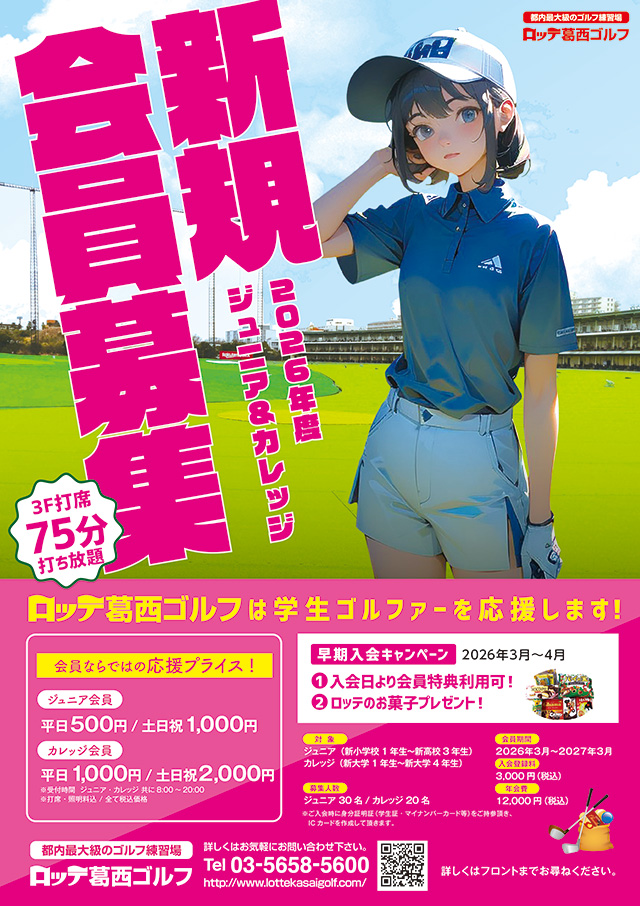 2026年度 早期学生会員入会キャンペーン 期間:2026/3/1(日)~4/30(木) 対象者: 2026年4月以降 新小学校1年生~新大学生4年生まで(6~23歳まで) 特典内容: ・入会日より学割価格にてプレー可能! ・3F打席 75分打ち放題 - ジュニア会員(新小学校1年生~新高校3年生): 平日 500円、土日 1,000円 - カレッジ会員(新大学1年生~新大学4年生): 平日 1,000円、土日 2,000円 ・お菓子詰め合わせもプレゼント! 登録料・年会費計:15,000円(現金支払いのみ) ※学生証・身分証明書(マイナンバーカード等)をご持参願います。