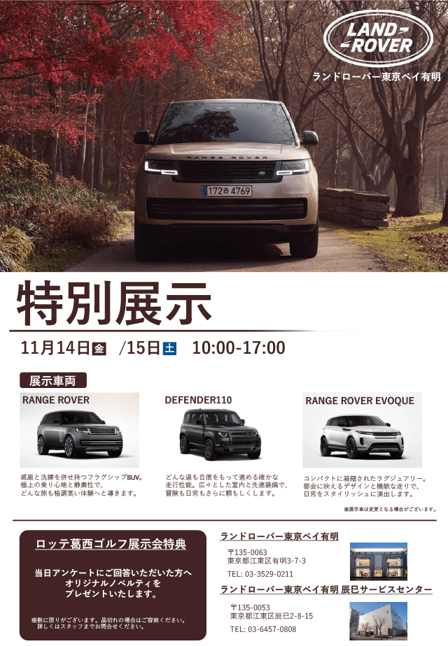 ランドローバー特別展示会 初開催! 英国王室御用達 ランドローバー特別展示会を開催致します。 開催日:11/14(金)、15(土) 10:00~17:00 開催場所:屋外イベントスペース 主催:ランドローバー東京ベイ有明 〒135-0063 東京都江東区有明3-7-3 TEL: 03-3529-0211 ※会場にてアンケートにお答えいただくとオリジナルノベルティをプレゼントいたします。お立ち寄り下さい。