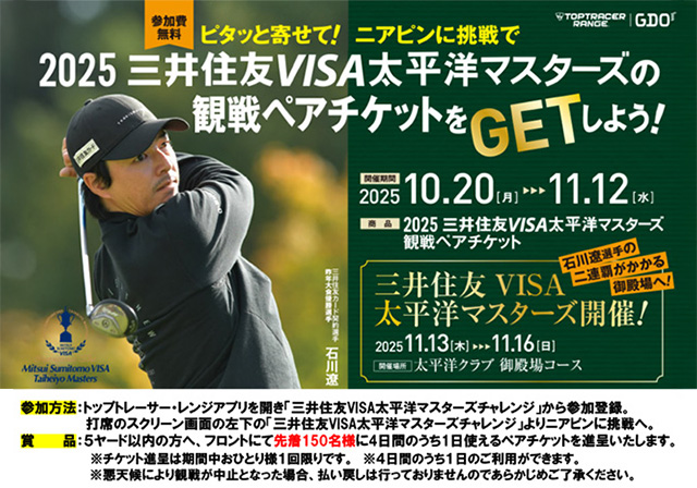 トップトレーサー・レンジのセントアンドリュースオールドコース11番ホール(167yard)のニアピンに挑戦し、5yard以内を達成すると、先着150名様に「三井住友VISA太平洋マスターズ観戦ペアチケット」をフロントにて進呈いたします。