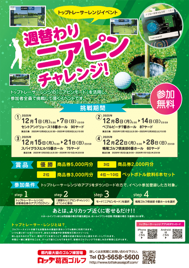 12月度のイベントといたしまして、トップトレーサー・レンジのニアピンモードから、毎週コースを替えてニアピンにチャレンジいただく企画を開催いたします。