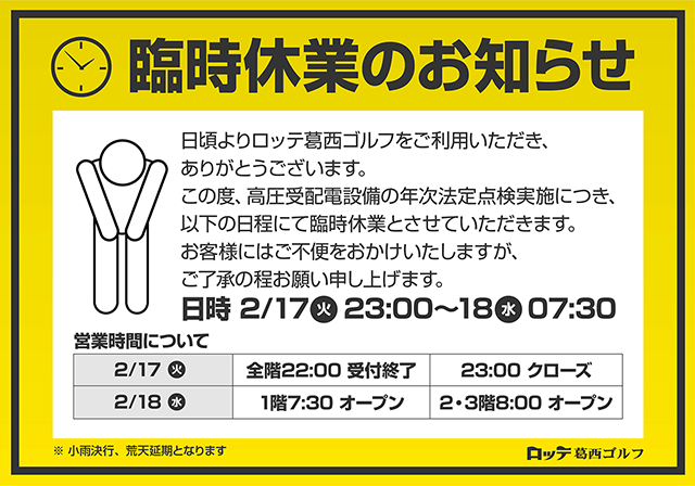 2/17(火)23:00~18(水)7:30 臨時休業のお知らせ 日頃よりロッテ葛西ゴルフをご利用いただき、ありがとうございます。 この度、高圧受配電設備の年次法定点検実施につき、以下の日程にて臨時休業とさせていただきます。 お客様にはご不便をおかけいたしますが、ご了承の程お願い申し上げます。 2/17(火)PM11:00(23:00)~18(水)AM7:30 営業時間について 2/17(火):全階22:00受付終了 23:00クローズ 2/18(水):1階7:30オープン 2・3階8:00オープン ※ 小雨決行、荒天延期となります。