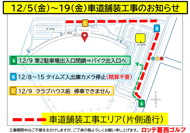 この度、ロッテ葛西ゴルフ内の正門から第1駐車場までの車道の舗装工事を行います。